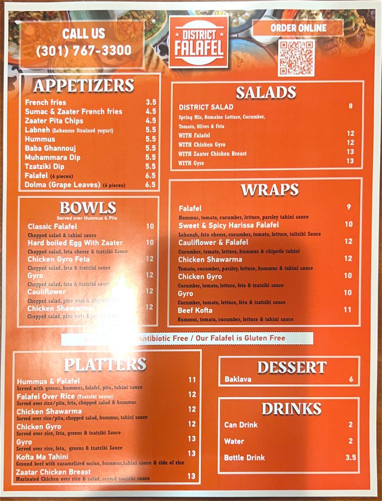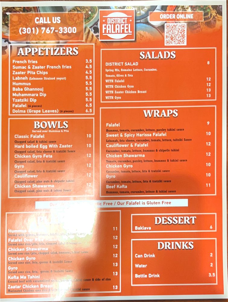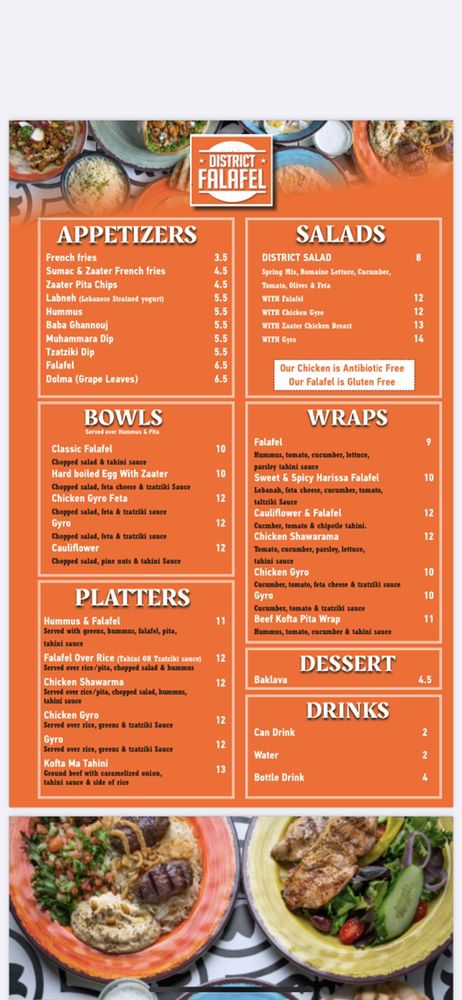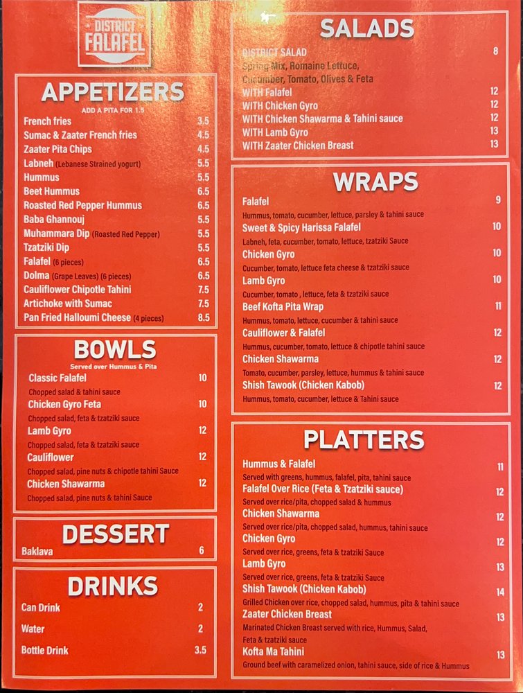 Located in Bethesda, MD, District Falafel is a vibrant culinary delight specializing in Mediterranean-inspired bowls and salads. Their menu features a selection of tantalizing dishes, such as the delicious Chicken Shawarma Bowl and the crispy Falafel Bowl, both priced at an accessible $12 to $15. Each bowl is accompanied by a fresh chopped salad and a variety of flavorful sauces like tahini and tzatziki. For salad enthusiasts, the District Salad—with options to add falafel or chicken gyro—offers a delightful mix of greens, cucumbers, tomatoes, olives, and feta, starting at just $10.